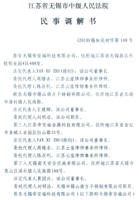 無錫帝安福VS南方(調(diào)解書)