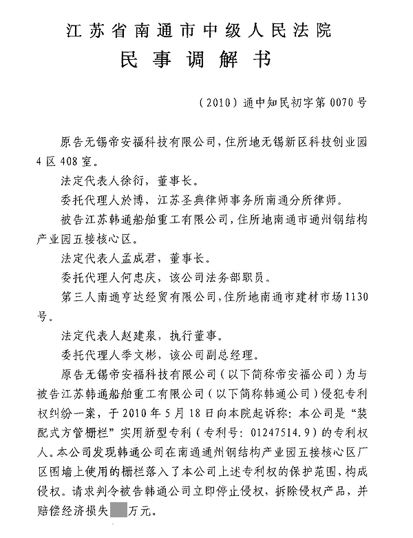 民事調(diào)解(無(wú)錫帝安福Vs韓通船舶、南通亨達(dá))